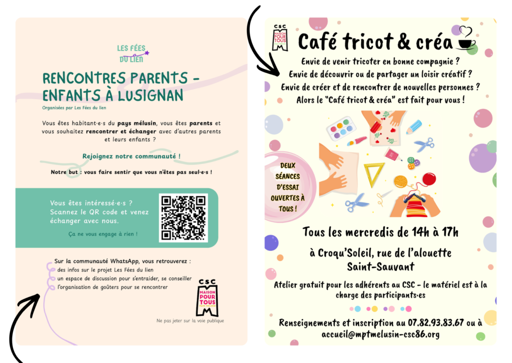 - “Café tricot et créa” chaque mercredi hors vacances scolaires de 14h à 17h dans les locaux de Croqu’soleil à Saint-Sauvant (deux séances découverte sans obligation d’adhérer au CSC.