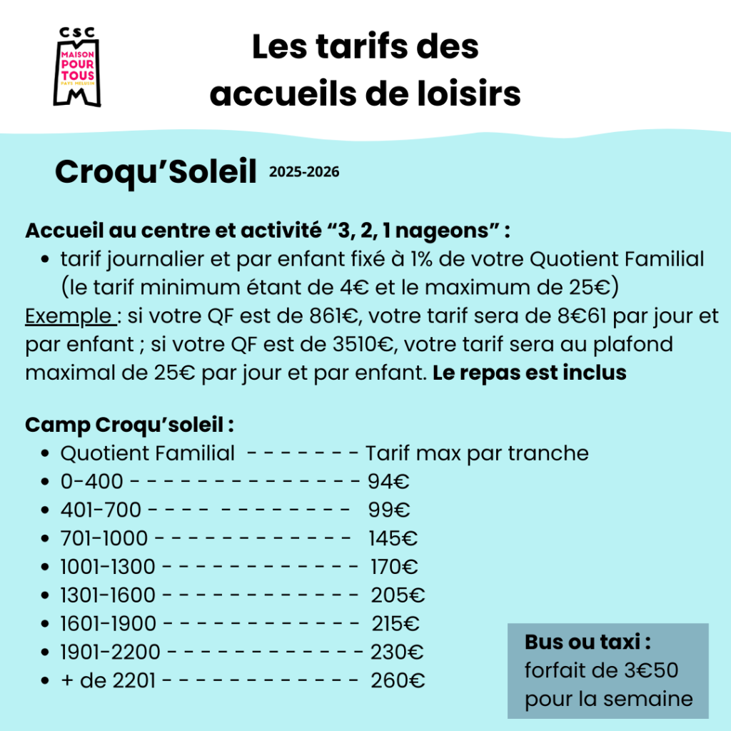 Le tarif d’une journée à Croqu’soleil se calcul en fonction du Quotient Familial et représente 1% de celui-ci ; avec un minimum de 4€ et un plafond à 25€ par jour et par enfant. Le transport est un forfait à la semaine de 3€50 par enfant. Plus d’informations sur les tarifs plus bas – tarif appliqués à la rentrée 2025.
