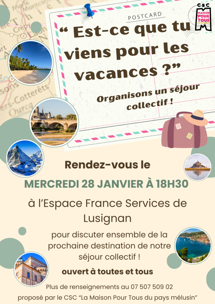« Tous les Évènements 1ère réunion séjour collectif – Lusignan 28 janvier - 18 h 30 min > 19 h 30 min « Cinéma “Les braises” – Lusignan Théâtre : S.B.A.M. » Ajouter au calendrier Google Agenda iCalendar Outlook 365 Outlook Live Détails Date: 28 janvier Heure : 18 h 30 min > 19 h 30 min Catégorie d’Évènement: Tous en minibus ! Organisateur La Maison Pour Tous E-mail : accueil@mptmelusin-csc86.org Voir le site Organisateur Lieu Espace France Services – Lusignan 7 rue Enjambes Lusignan, 86600 France + Google Map