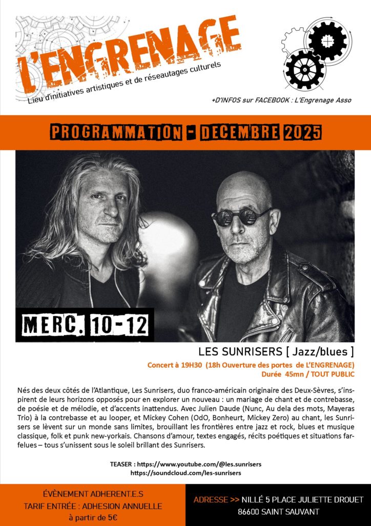 « Tous les Évènements Concert “The Sunrisers” à l’Engrenage – Saint-Sauvant 10 décembre - 19 h 30 min > 21 h 00 min €5 « Conte musical de Noël par le classe CHAM – Lusignan Téléthon – Jazeneuil – Des animations toute la journée ! » Ajouter au calendrier Google Agenda iCalendar Outlook 365 Outlook Live Détails Date: 10 décembre Heure : 19 h 30 min > 21 h 00 min Prix : €5 Catégorie d’Évènement: Concert Organisateur L’Engrenage E-mail : lengrenage5@gmail.com Voir le site Organisateur Lieu L’Engrenage 5 place Juliette Drouet Saint Sauvant, 86600 + Google Map Voir Lieu site web