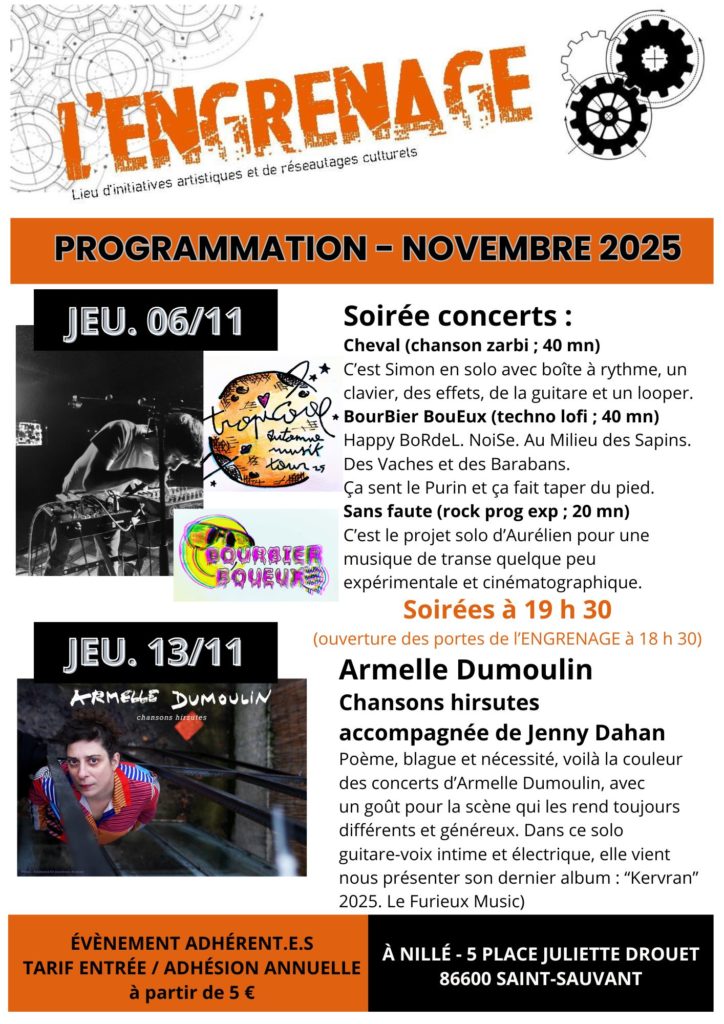 « Tous les Évènements Cet évènement est passé Soirée concert à l’Engrenage – Saint-Sauvant 6 novembre - 19 h 30 min > 22 h 00 min « Marché des créateurs – Lusignan Chansons hirsutes à l’Engrenage – Saint-Sauvant » Ajouter au calendrier Google Agenda iCalendar Outlook 365 Outlook Live Détails Date: 6 novembre Heure : 19 h 30 min > 22 h 00 min Catégorie d’Évènement: Concert Organisateur l’Engrenage Voir le site Organisateur Lieu l’engrenage Nillé, 5 place Juliette Drouet Saint Sauvant, 86600 + Google Map
