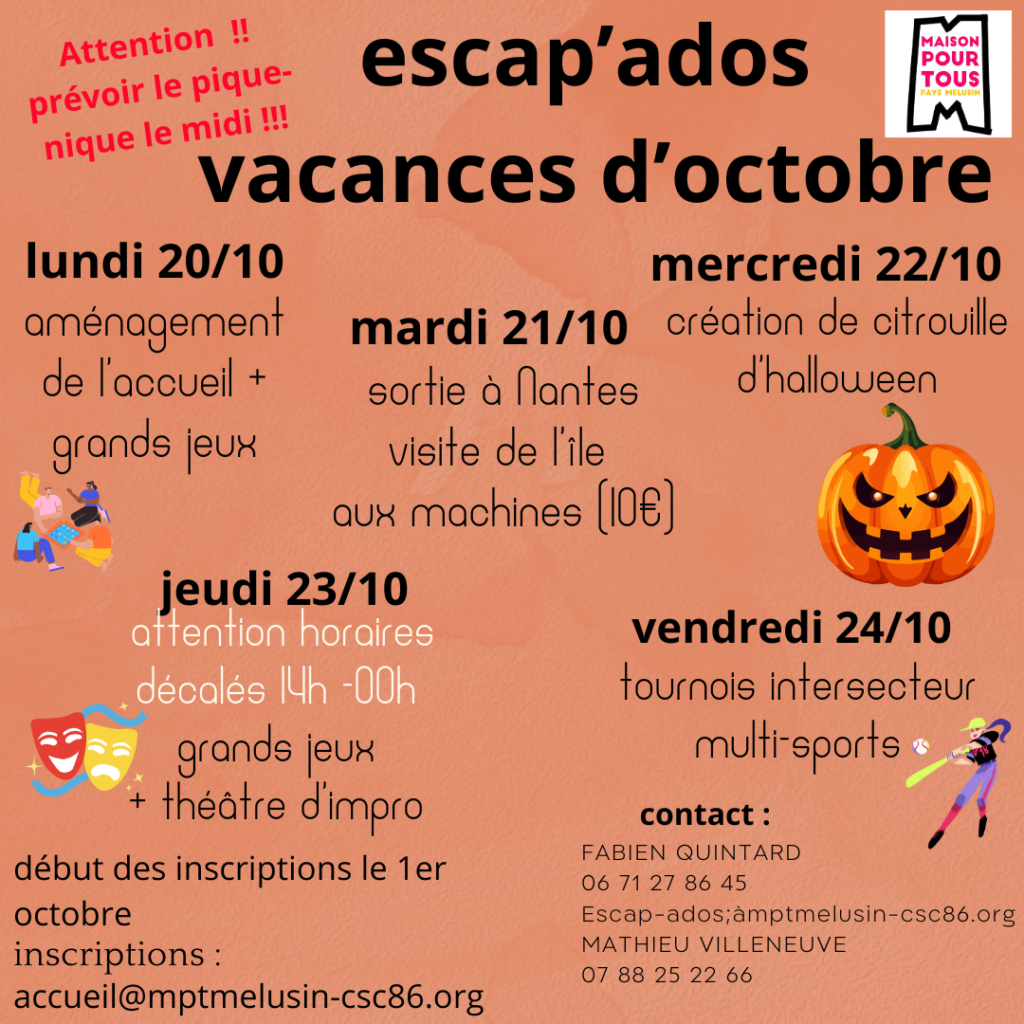 - du 27 au 31 octobre : chantier loisirs qui se déroulera à l’accueil d’Escap-Ados à France Services, Lusignan. Un chantier loisirs sur le thème de la créativité (à confirmer par Fabien : création d’un logo pour Escap-Ados) Les tarifs des chantiers loisirs sont consultables ICI.