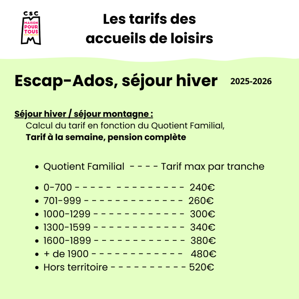 L’accueil informel est ouvert pour les jeunes à partir de 11 ans ; toutefois, en cas de forte demande, une priorité sera donné aux 12-18 ans car ceux-ci n’ont plus l’âge d’âtre accueilli au centre de loisirs Croqu’soleil (accueil pour les 3 – 11 ans). Cette situation reste une mesure exceptionnelle mais peut survenir à certaines périodes de vacances scolaires. Des ce cas, vous serez averti par le directeur de l’Escap-Ados.